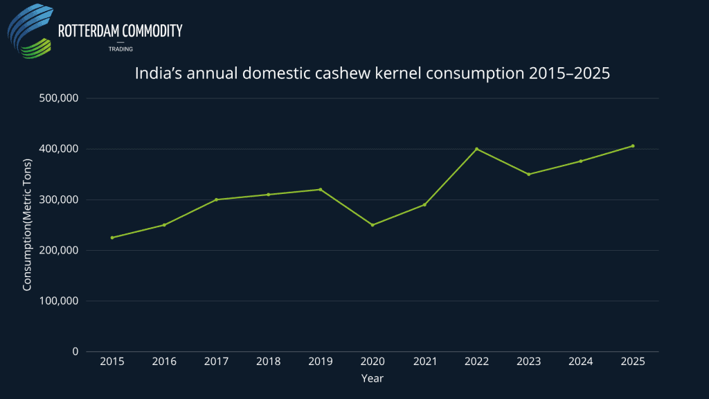 India’s annual domestic cashew kernel consumption, 2015–2025. Data sourced from CEPCI, INC, and industry reports.